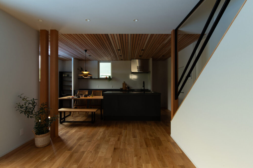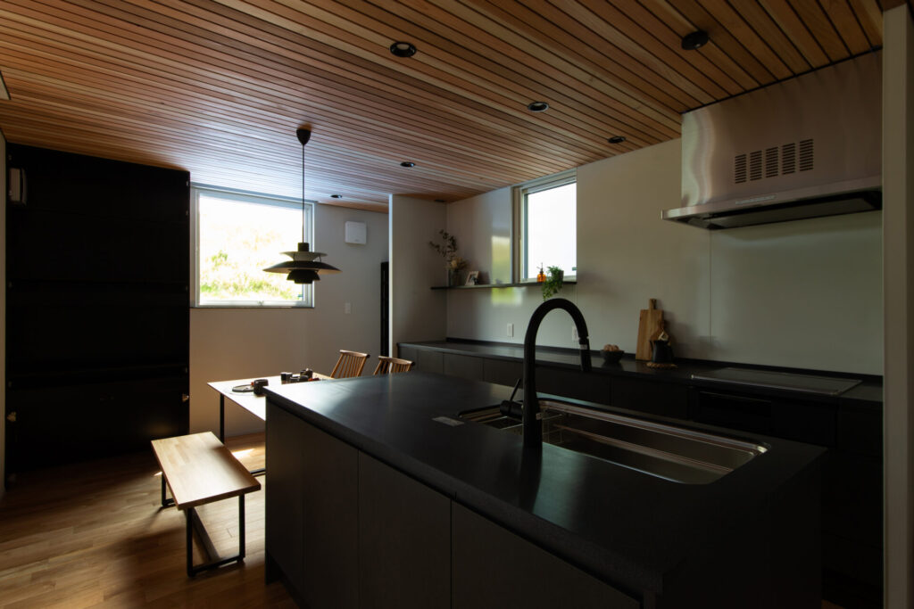 木のぬくもりを感じる天井と床に、マットブラックのキッチンが調和した、洗練された美しさが印象的な空間です。