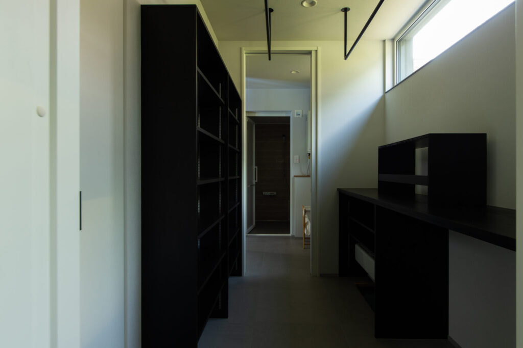 黒の収納棚とカウンターが並ぶこの空間は、洗濯や整理整頓に特化したユーティリティスペース。