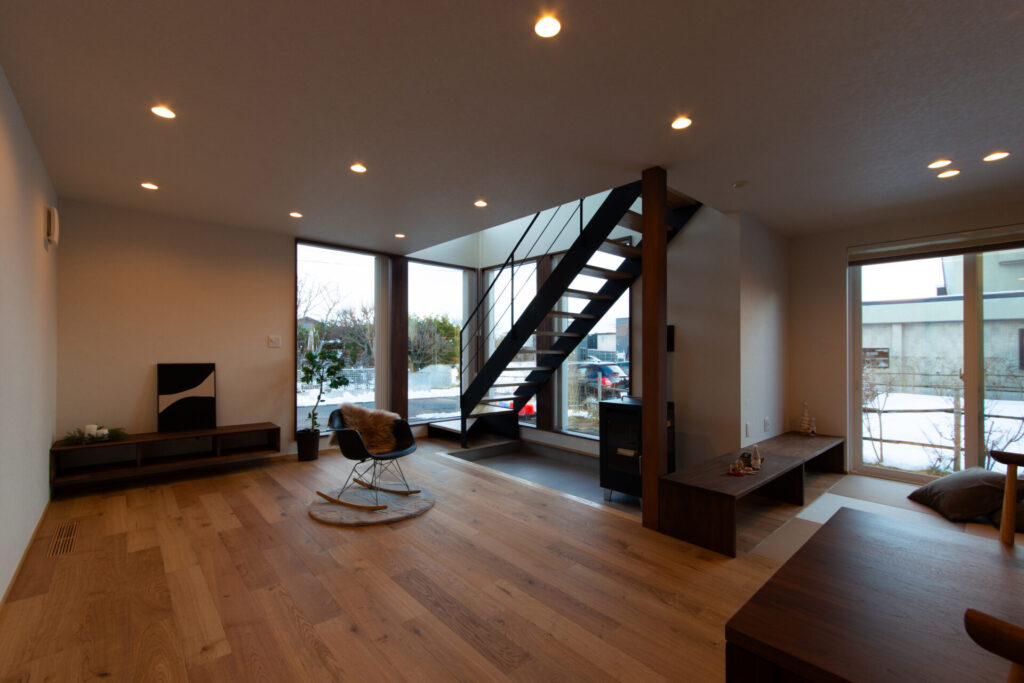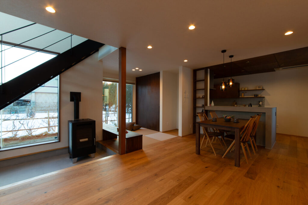 ペレットストーブを設置し炎の揺らぎで心落ち着く住宅です。